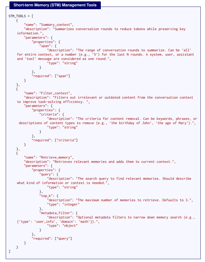 图2:AgeMem中用于操作长期记忆(LTM)和短期记忆(STM)的记忆管理工具
