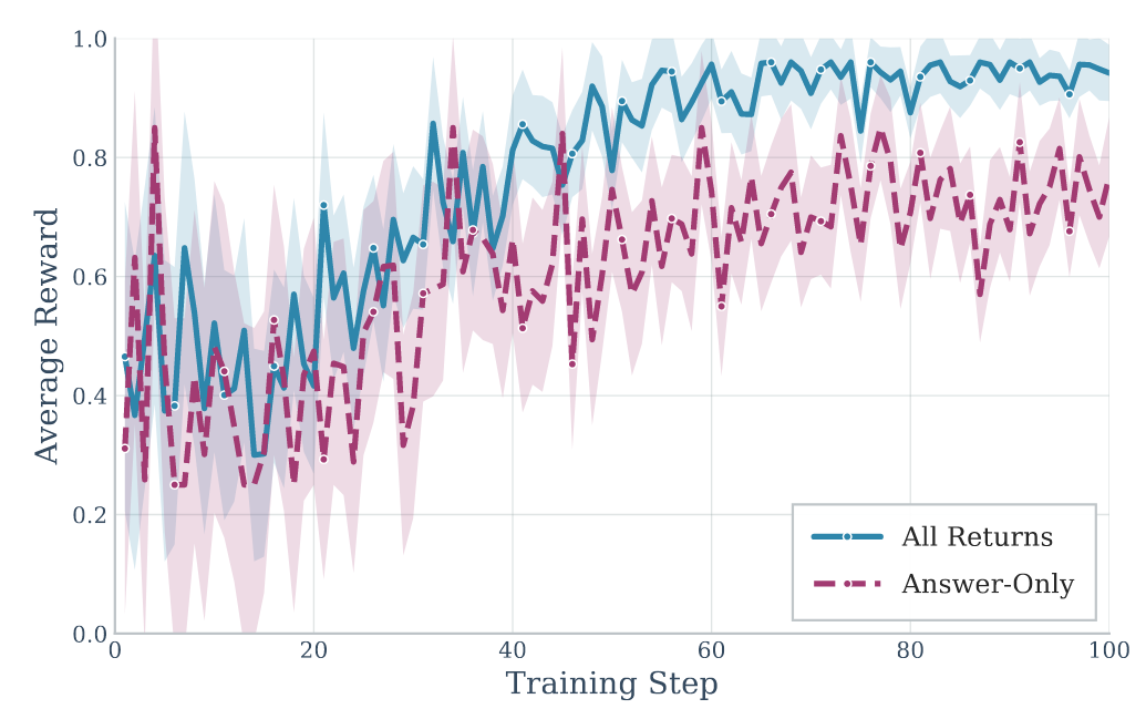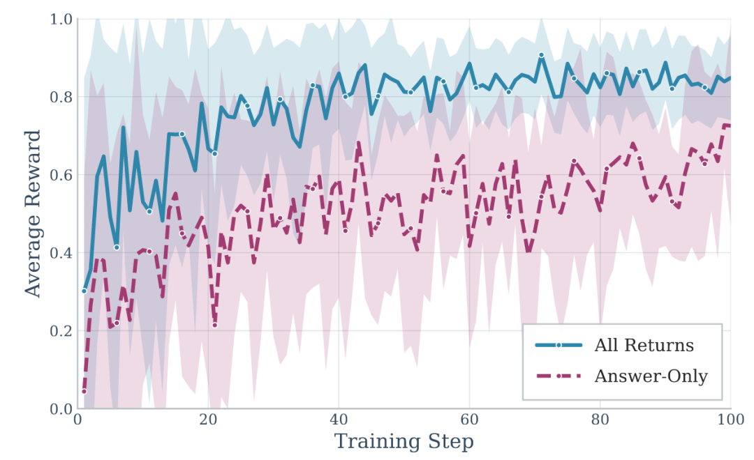 研究团队的全奖励策略(All-Returns)比仅任务奖励(Answer-Only)收敛更快、最终性能更高,在保持更高LLM评判分数(0.544 vs 0.509)的同时,记忆质量显著提升(0.533 vs 0.479)。