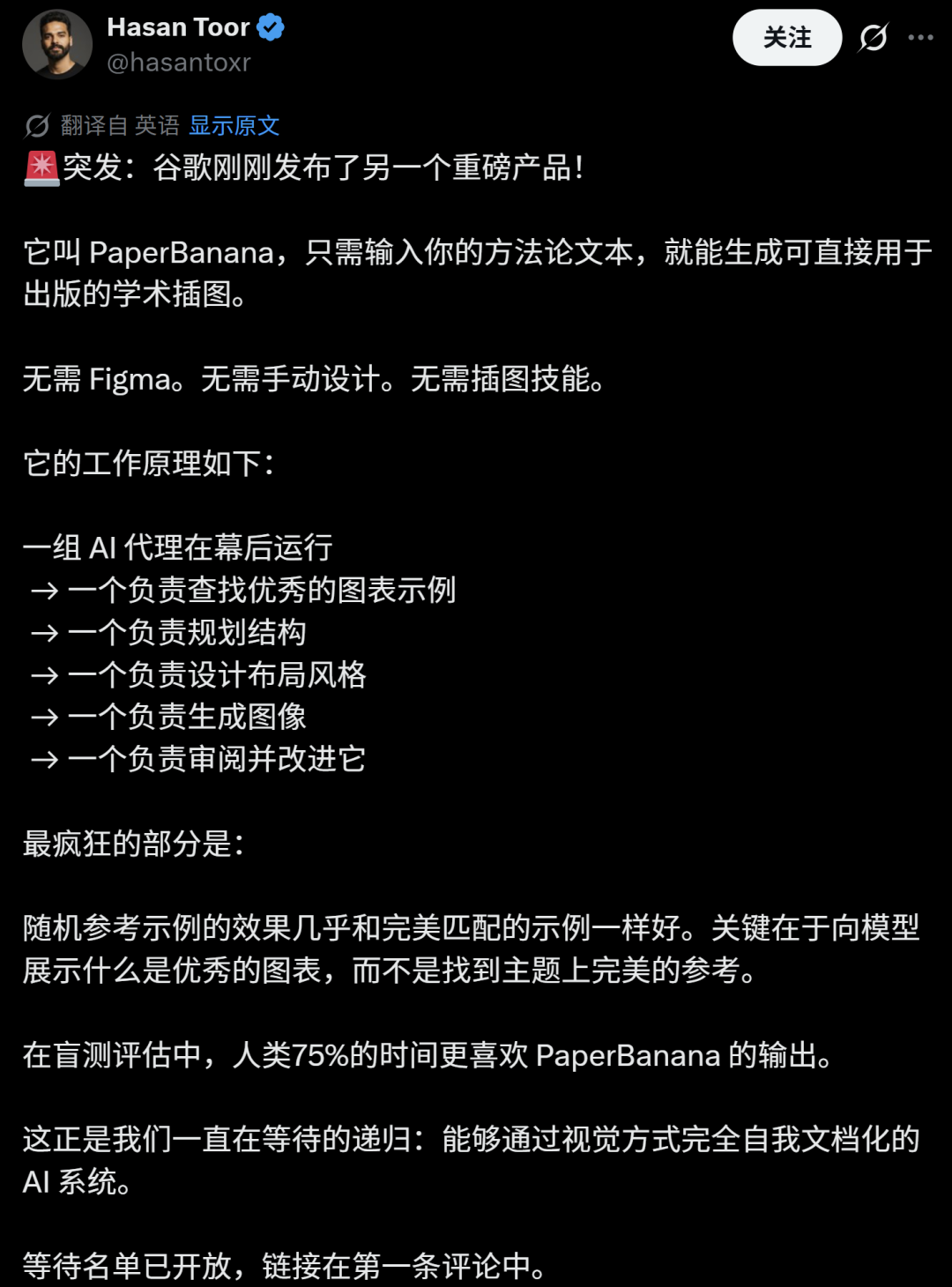 而粉丝量高达41万的博主,AI教育专家Hasan Toor发帖称,PaperBanana随机参考示例的效果与完美匹配的示例一样好,盲测中人类75%倾向PaperBanana!