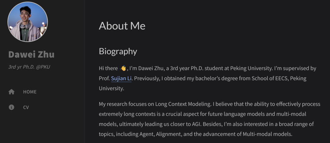Dawei Zhu的研究方向集中在长上下文建模(Long Context Modeling)、智能体(Agents)、模型对齐(Alignment)与大模型能力扩展等前沿领域,其多篇论文已在 ACL、ICLR、EMNLP、COLING、AAAI 等顶级会议发表或收录,部分论文引用量已达数百次。