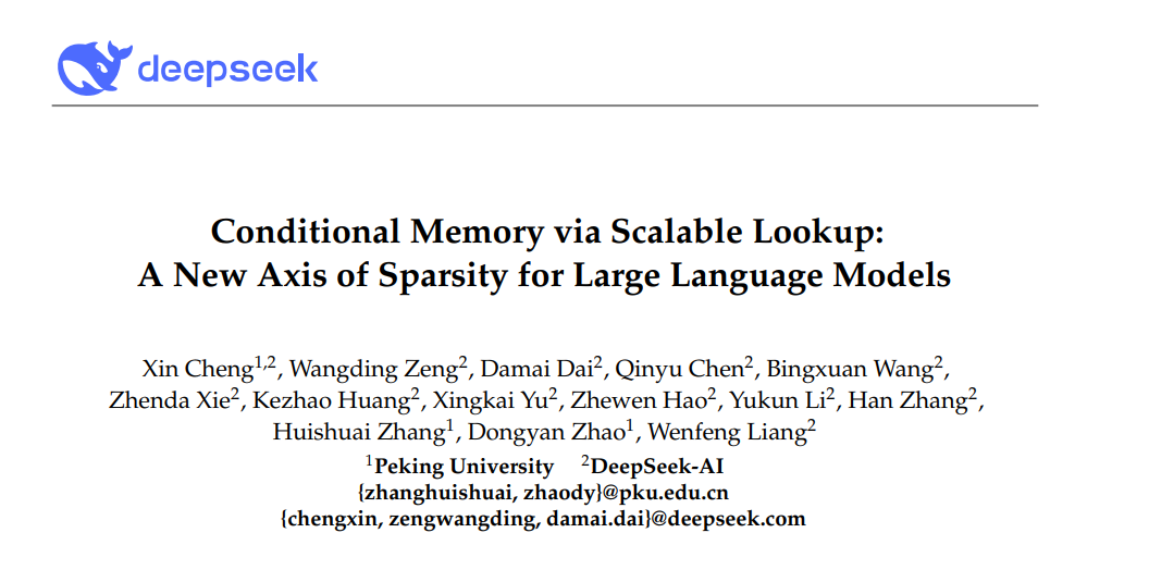 DeepSeek最新开源的「记忆」模块再次刺痛硅谷!当行业仍在为扩大模型参数量激烈竞争时,DeepSeek与北京大学的研究者们提出了一个颠覆性思路:给稀疏模型引入“条件记忆”,使大模型得以从根本上摆脱用昂贵计算动态重建静态查表的低效模式,为下一代稀疏模型奠定了一种全新的基础范式。研究团队引入Engram模块以实现条件记忆,上线不足24小时便在GitHub斩获 1.2k star,同时在社交平台上引发技术圈火热讨论,包括PyTorch核心维护者Dmytro Dzhulgakov在内的不少专业开发人员对其表示认可。