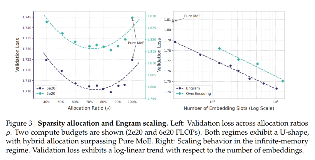 为量化模型推理和知识检索之间的协同效应,研究团队将其形式化为“稀疏分配问题”(Sparsity Allocation Problem):在总参数预算固定的前提下,应如何在 MoE 专家和 Engram 记忆之间分配容量?研究团队通过实验揭示了一条U形scaling law,表明在 MoE 专家与 Engram 记忆之间进行混合分配稀疏容量,会优于纯 MoE 基线模型。