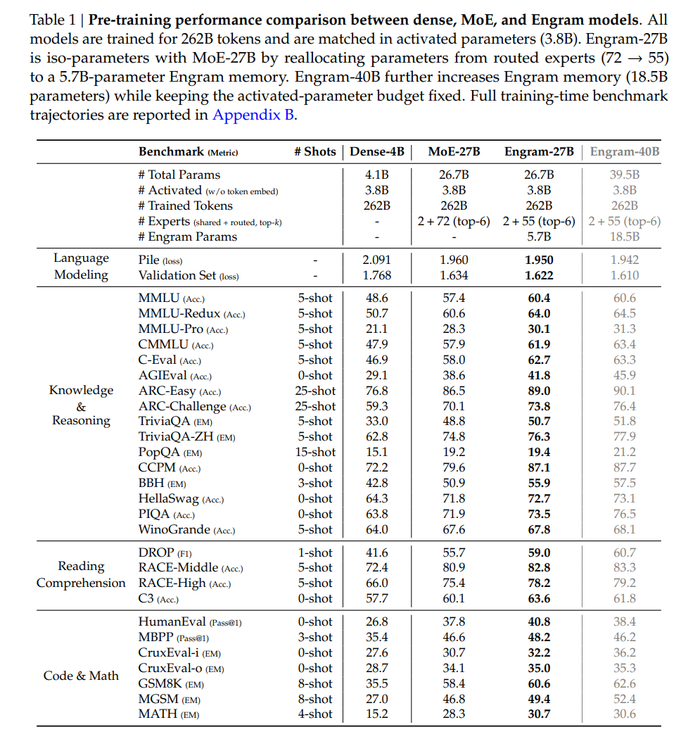 依据该分配规律,研究团队将 Engram 参数规模扩展至27B。在多个领域均取得了更优的性能。值得注意的是,尽管记忆模块从设计直觉上聚焦于提升知识检索能力,但其在通用推理、代码和数学任务上的增益幅度反而更为突出。