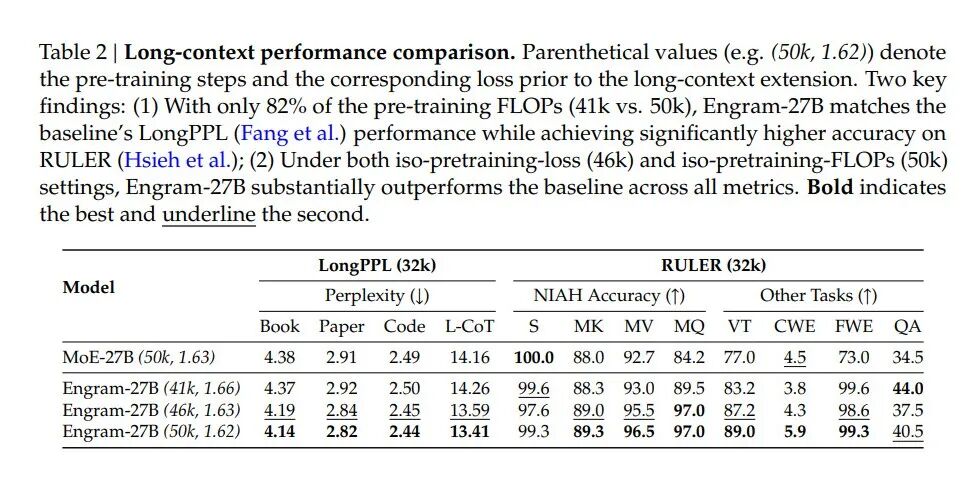 Engram 减轻了主干网络在早期层重建静态知识的负担,从而释放出更多有效深度用于复杂推理。此外,通过将局部依赖交由查表处理,Engram 释放了注意力机制的容量,使其能更专注于全局上下文,从而大幅提升长上下文处理能力。