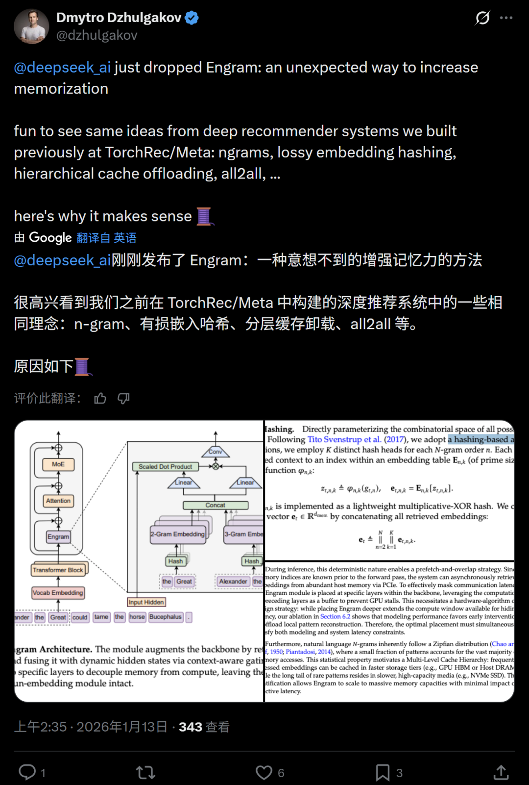PyTorch 核心维护者之一,并曾参与 ONNX 的联合创建的开发者Dmytro Dzhulgakov,对DeepSeek开源的Engram工作表达了比较积极的态度,并表示其理念与他曾在Meta中参与过的一些工作相似。