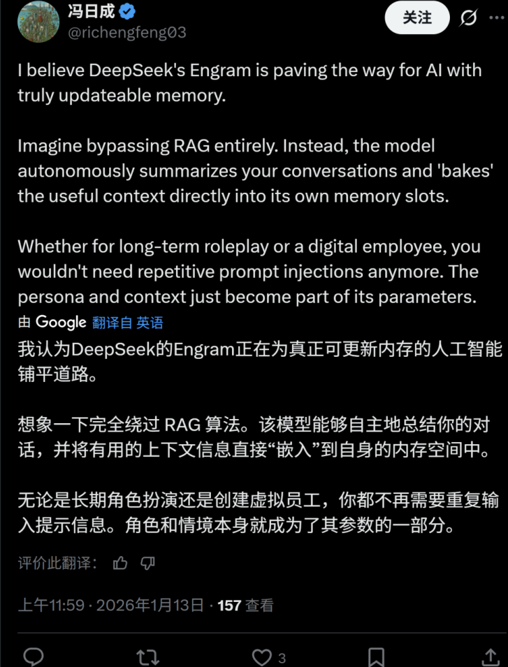 也有网友对该工作提出了非常高的评价,表示Engram为未来的AI铺平了道路,例如说未来如果要进行长期的角色扮演,在长时间的过程中,通常的大模型会丢失上下文信息,并且可能需要重复输入prompt。但是有了Engram后,角色与情境本身就是其一部分: