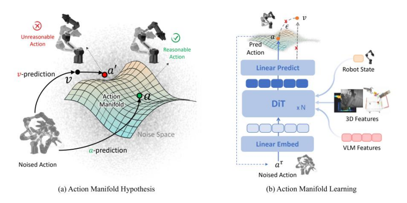 据此该团队设计 Action Manifold Learning(AML):以 DiT(Diffusion Transformer) 为动作专家骨干,不再以预测噪声为核心目标,而是更直接地学习生成“可行、平滑、连续”的动作序列,从而在效率、稳定性与高维动作空间建模方面取得优势。