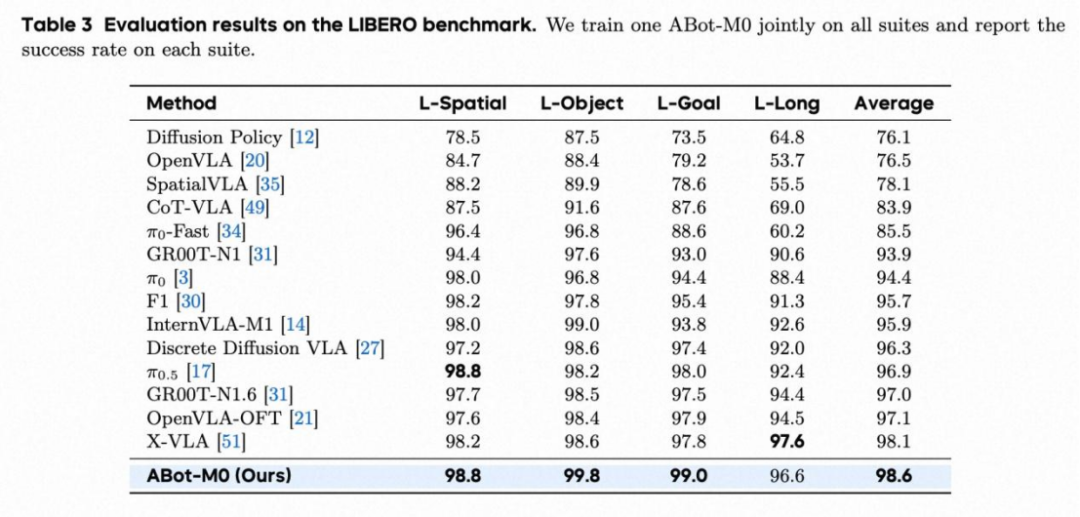 LIBERO:平均成功率 98.6%,在长序列任务上表现突出。