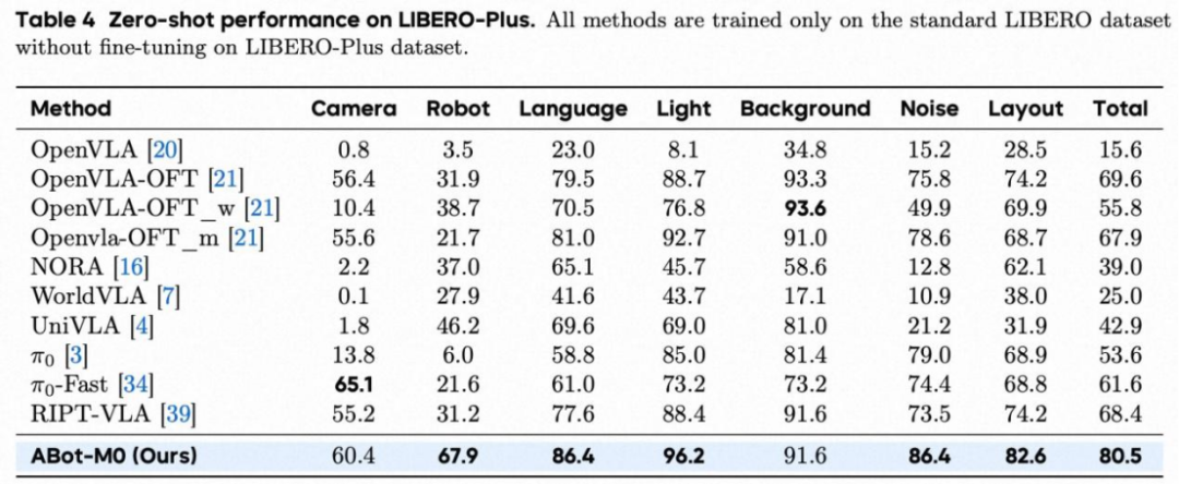 LIBERO-Plus(零样本鲁棒性评估):成功率 80.5%,显著领先多种强基线,体现对视觉/语言扰动与场景变化的稳健泛化能力。