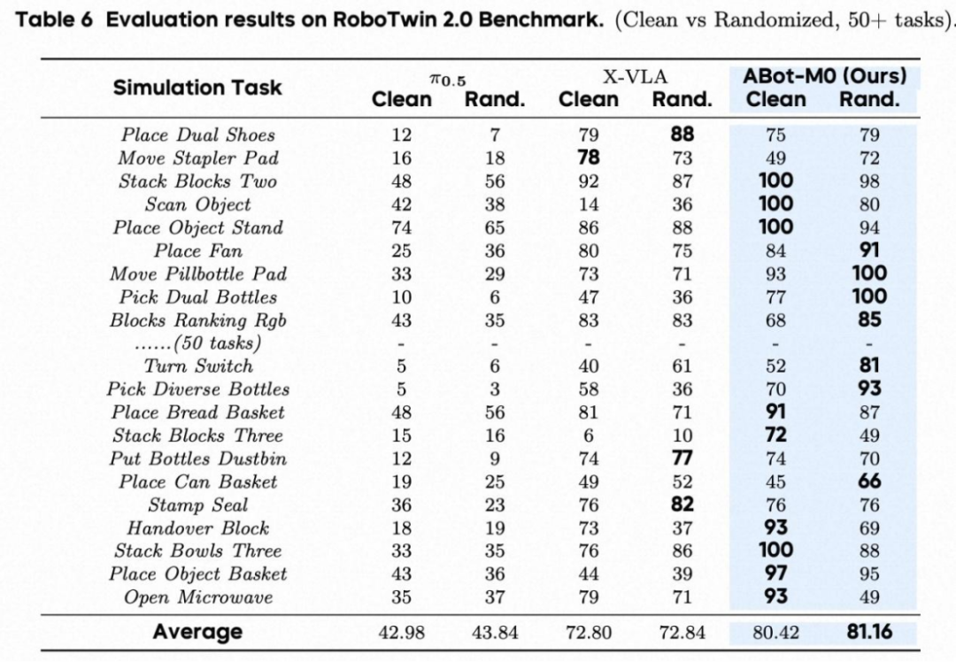 RoboTwin 2.0(多任务 + 强随机化):随机化场景下成功率 81.2%,优于π0.5、X-VLA 等基线,体现跨任务鲁棒学习能力。