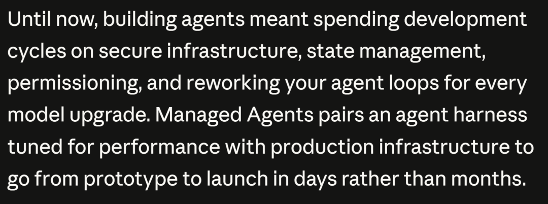 官方博客介绍其强大的工作能力,内容翻译:“迄今为止,构建智能体需要在开发周期中投入资源用于安全infra、状态管理、权限控制以及为每次模型升级重新设计智能体循环。Managed Agents将针对性能优化的智能体框架与生产级infra相结合,使从原型到发布的流程从数月缩短至数天。”,同时博客标题直言速度快10倍。