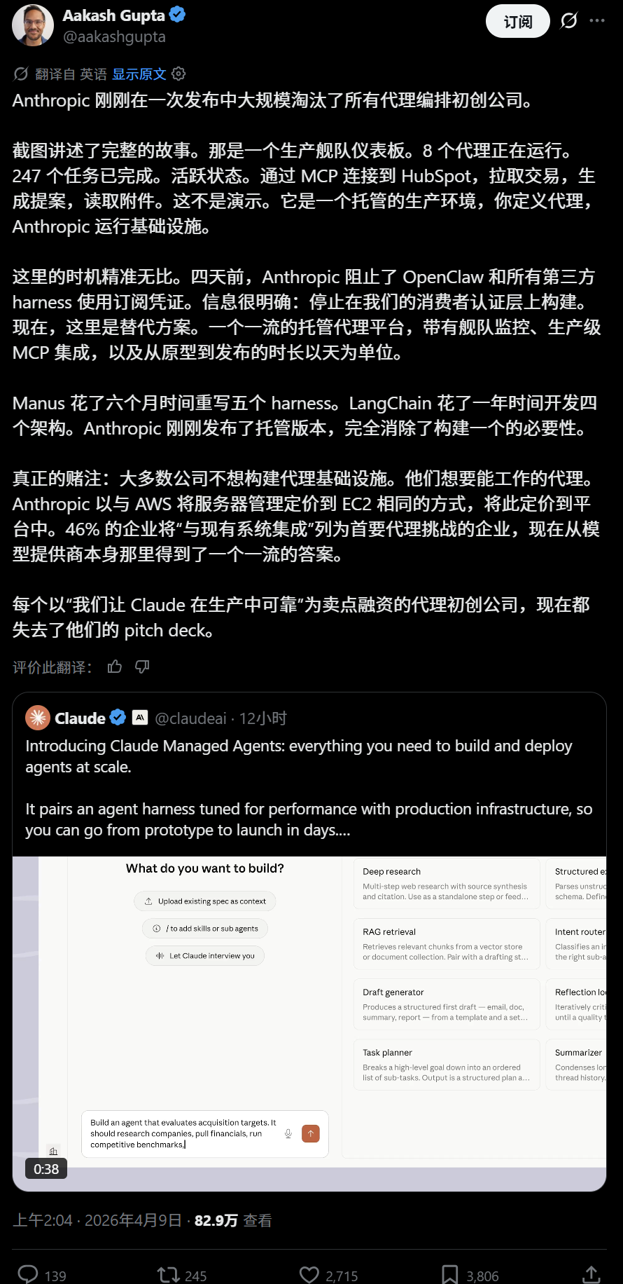 例如知名AI分析师和创业者Aakash Gupta直言道,“该发布直接大规模淘汰了该领域的所有初创公司”。Manus用了半年重构5个harness、LangChain用了一年开发了4个架构,而Anthropic发布的这个直接完全消除了再构建一个的必要性。