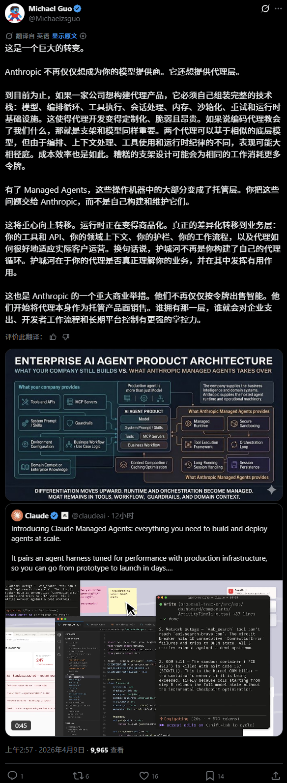 Claude Managed Agents彻底把过去开发者需要搭建的一些Agent Infra等全部都商品化,开发者只需要把这些交给Anthropic统一托管即可,不再需要一点点调试、一点点构建。这也就意味着,对精力有限的独立开发者来说大模型的潜力不再被底层的工程瓶颈拖累。