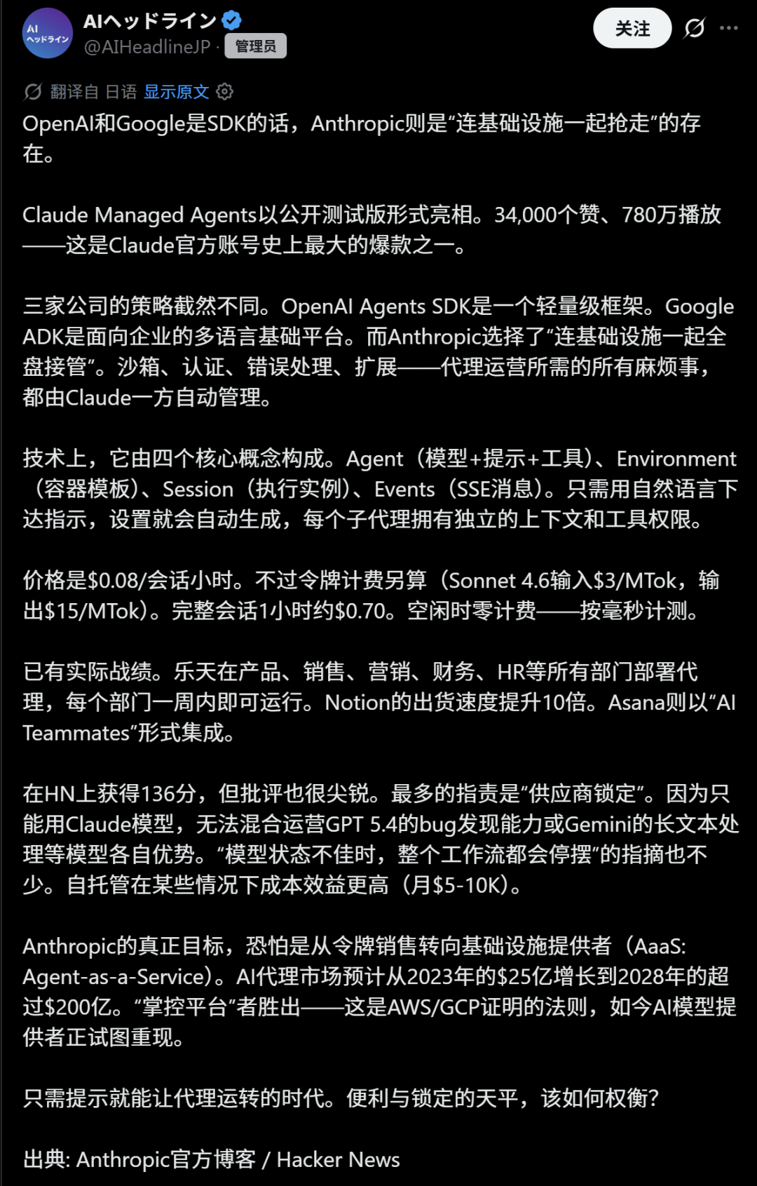 然而当开发者深度依赖Anthropic的Claude Managed Agents这一Harness后,未来如果想要迁移,则成本可能会远高于自建方案。另外,Harness内部的决策逻辑仍然是平台侧的黑箱,因此在风险控制方面仍然需要打一个问号。