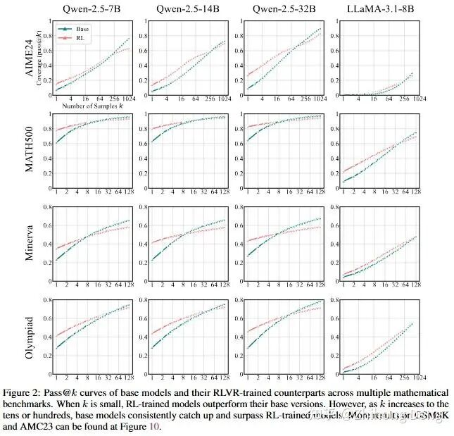 RLVR 模型在 pass@1 上是比 base 高,但给了足够多的抽样次数,它在大 k 下的 pass@k 是不是也更高?