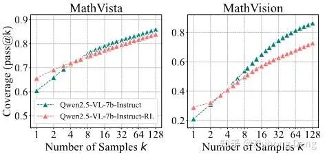 这说明:RLVR 的这个特点不是纯文本任务的特例,而是存在于更普遍的推理任务上。小结一下,这里并非RL模型的能力,在 pass@1 这种用户指标上RL模型确实更强,但要说它们在推理能力上比基座高出一截,这篇论文给出的证据是:并没有。