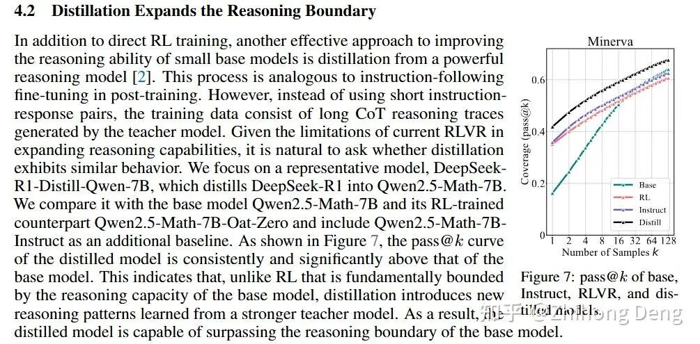 看过R1论文的话,应该会对文中关于小模型走蒸馏比zero RL的效果更好。现在想来,这是埋了个伏笔。这里说的蒸馏并不是传统蒸馏,而是指用老师模型生成一堆推理轨迹,然后让学生模型直接SFT。作者也对比了蒸馏和RL模型的区别,同样用 pass@k 评估,看学生模型在大 k 的表现和 base 比,到底有没有扩展 solvable set。