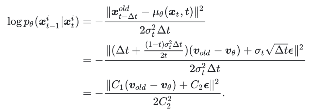 其中 代表训练时的一步预测但不加噪声,而 表示采样过程的一步预测加噪声。在每一步, 是一个常数,在 中可以被约掉,所以对数概率可以化简为: