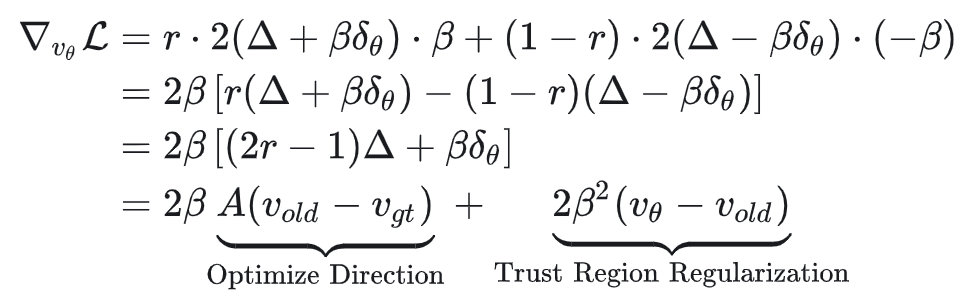 一番推导下来,可以看到这里有两项梯度,其中第一项跟AWM的形式很类似,起到指定优化方向的作用,而第二项起到了trust region的作用,熟悉RL历史的朋友会一下子想起来TRPO[5],而PPO clip[6]实际上是TRPO的一个改进,都是起到拉住模型不要崩溃的作用。也是因为这里有一个类似trust region的约束项,所以DiffusionNFT并不需要使用PPO clip即可让优化稳定进行下去。