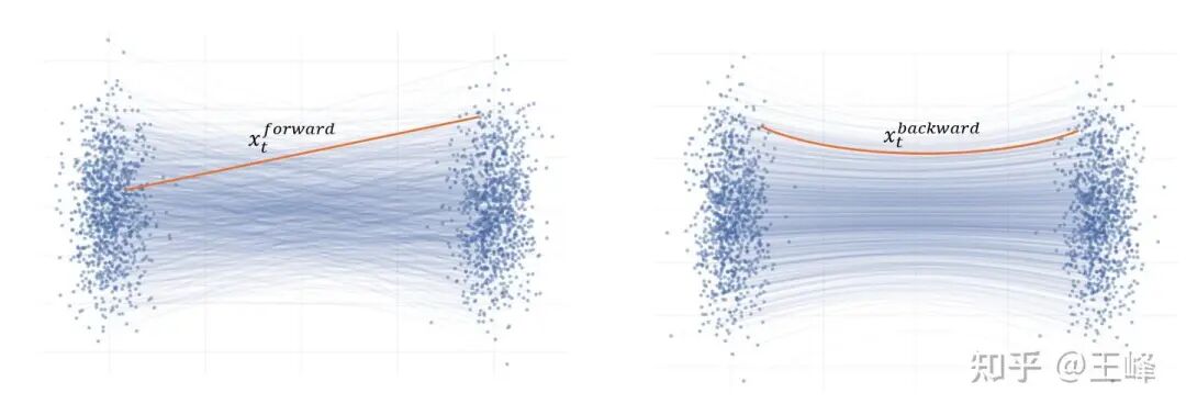 除了梯度和old model的更新方式上的区别之外,这几个算法还有一个区别是它们的输入 。Flow-GRPO使用的是采样过程中产生的 ,而AWM和DiffusionNFT使用的是重新加噪的 。在DiffusionNFT论文中,将重新加噪的过程定义为Forward过程,而采样过程中的 定义为Backward过程中得到的。这里还是用那张经典的flow matching训练-测试区别的图来解释一下: