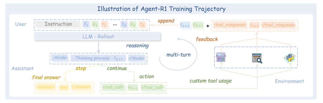 如上图所示,Agent 在 Rollout 阶段进行多轮推理与工具调用,接收环境反馈,最终用完整轨迹进行 RL 更新。