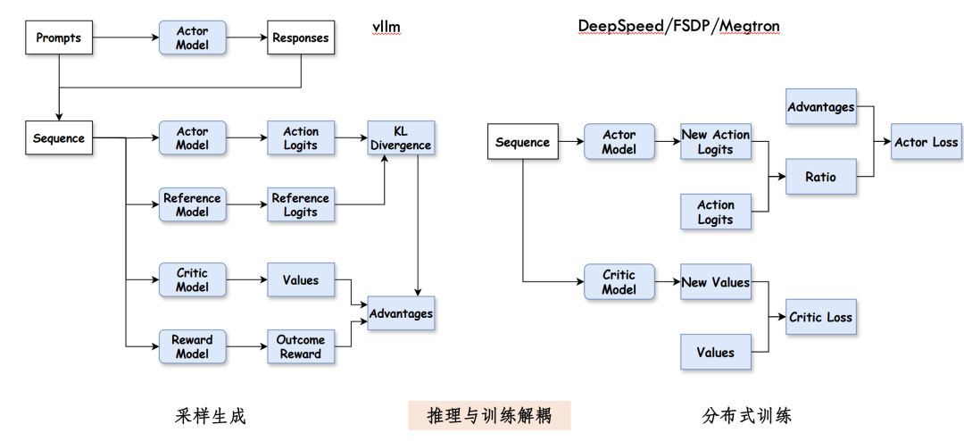 Agent-R1 采用业界成熟的分布式训练链路,将采样生成与梯度更新彻底解耦: