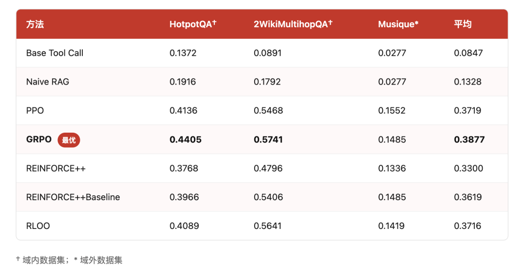所有 RL 训练方法均大幅超越基线:最弱的 RL 算法(REINFORCE++,平均 EM 0.33) 仍比 Naive RAG(0.13)高出约 2.5 倍。GRPO 综合表现最优, PPO 在域外 Musique 数据集上表现突出,展现了良好的泛化能力。