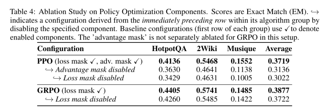 消融实验证明 Action Mask(用于损失计算与优势对齐) 是 Agent-R1 框架中最关键的设计之一。 去掉 loss mask 或 advantage mask 均会导致性能显著下降, 说明精确的信用分配对多轮 Agent 训练至关重要。