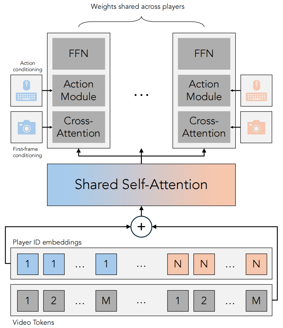 模型的架构基于 Matrix Game 2.0 ,这是一个在包括 《我的世界》在内的多个视频游戏上训练的单智能体可控视频 DiT 模型。图 1 可视化了研究团队提出的多智能体DiT模块。