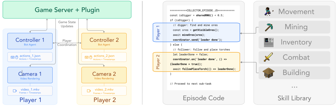 图 2 SolarisEngine 系统概览。 (左)基于 Docker 的容器化游戏服务器、相机机器人与控制器机器人编排架构。相机机器人通过自定义服务端插件镜像控制器的状态与动作;控制器为运行情节代码并记录底层动作的 Mineflayer 机器人。(右)情节通过组合共享库中的可复用基础技能构建。图中展示了简化的“采集者”情节代码示例。