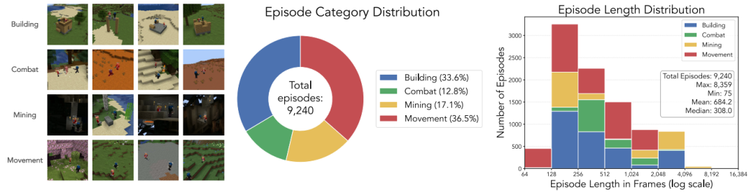 多人在线训练数据集:如图 3 所示,该数据集涵盖建造、战斗、移动、采矿等核心任务,在“超平坦”与“普通”世界中均衡采集,总计每玩家 632 万帧。其中包含昼夜、生物群系、工具使用、天气等多样状态,动作标注包括 WASD 移动、视角控制及挖掘、放置等交互。该数据集是首个适用于机器学习的多人在线《我的世界》动作标注数据集。