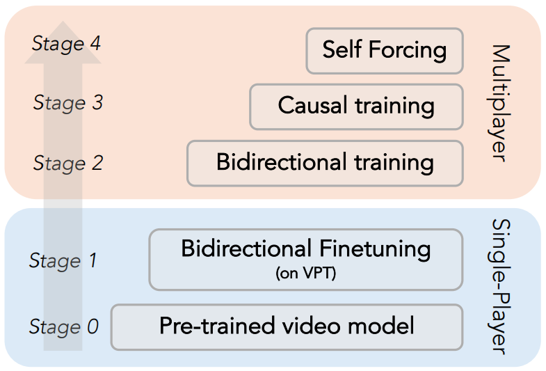 模型从 Matrix-Game 2.0 的预训练权重初始化。为覆盖完整的《我的世界》动作集,模型在 VPT 数据集上进行微调,采用双向注意力机制,以 33 帧的上下文长度训练 12 万步。这一单智能体预训练阶段为后续的多智能体建模奠定了有效的初始化基础。