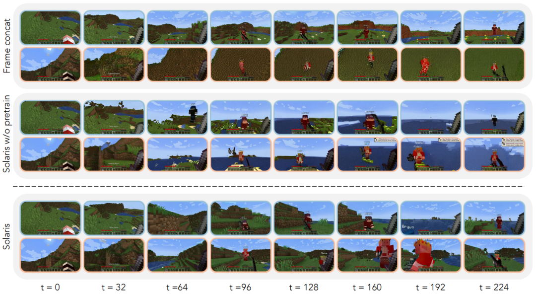研究团队将所提出的架构实现与 Multiverse 的帧拼接方法进行了对比,后者是本研究之前唯一现存的多人世界模型。同时,通过将本文方法与未使用单智能体模型初始化的变体进行性能比较,验证了单智能体预训练的必要性。