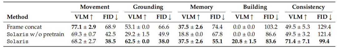 为全面评估模型能力,研究团队设计了一套留出情节类型,涵盖运动、空间定位、记忆、建造与一致性五个维度。视觉质量采用 FID 衡量,语义遵循度则引入“VLM 作为评判者”指标:向视觉语言模型提出与任务相关的可验证问题,若其答案与预期一致,则视为生成正确。