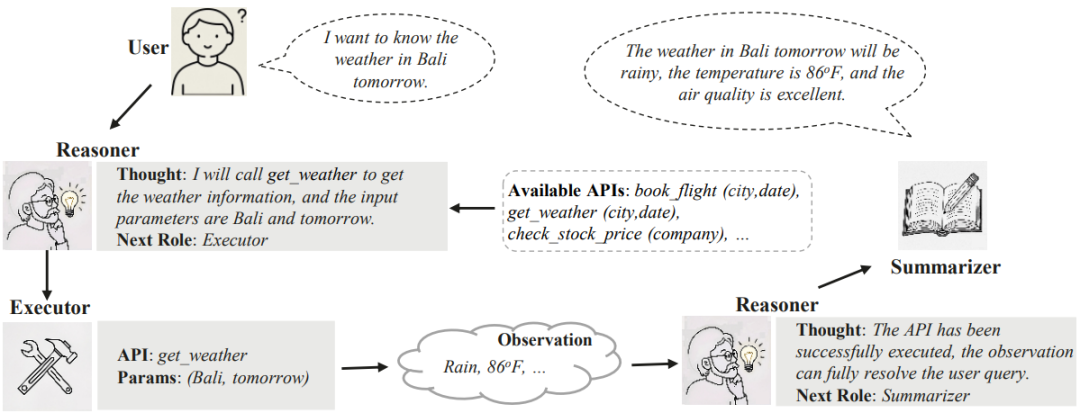 让 LLM 的权重同时学习多种能力(如推理、工具调用、状态跟踪等)具有挑战性,尤其当模型采用低秩形式时更为困难。因此,研究者提出将智能体能力分解为三个独立角色。多个角色协作完成一项智能体任务的流程如图1所示。