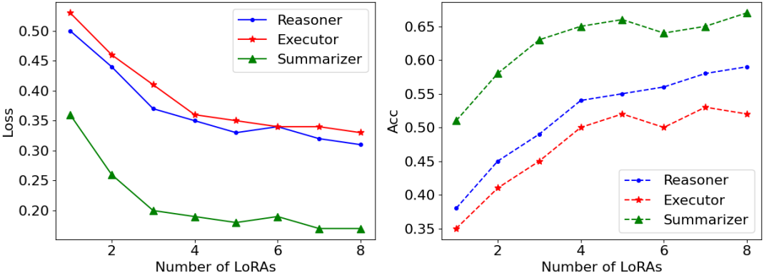 为在模型性能与可训练参数量之间取得平衡,研究者基于 Llama3.2-1B-Instruct 模型开展小规模消融实验,以确定推理者、执行者和总结者各自最优的 LoRA 配置。