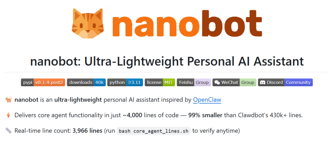 就在大家为 OpenClaw 的臃肿头疼时,香港大学数据智能实验室(HKUDS)开源了轻量级的个人AI助手 nanobot,仅3966行,纯Python 代码实现,便于部署和适配各类场景。该项目在github上已收获 28.1k Stars。