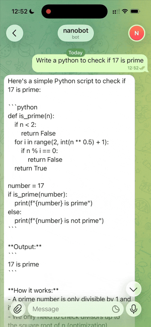 编程助手:输入实际的开发需求或代码问题,nanobot 会一步步分析需求、给出架构建议、生成完整代码片段、解释关键逻辑,甚至通过内置工具运行小段测试代码来验证结果。