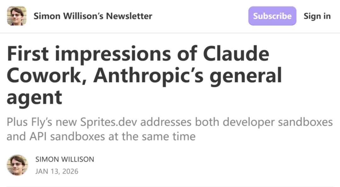 Simon Willison称Cowork实质上是Claude Code的“通用智能体”版本,隐藏了终端界面,使其更易于非技术用户使用,但底层仍是相同的框架,能够通过代码或命令完成几乎任何计算机任务。