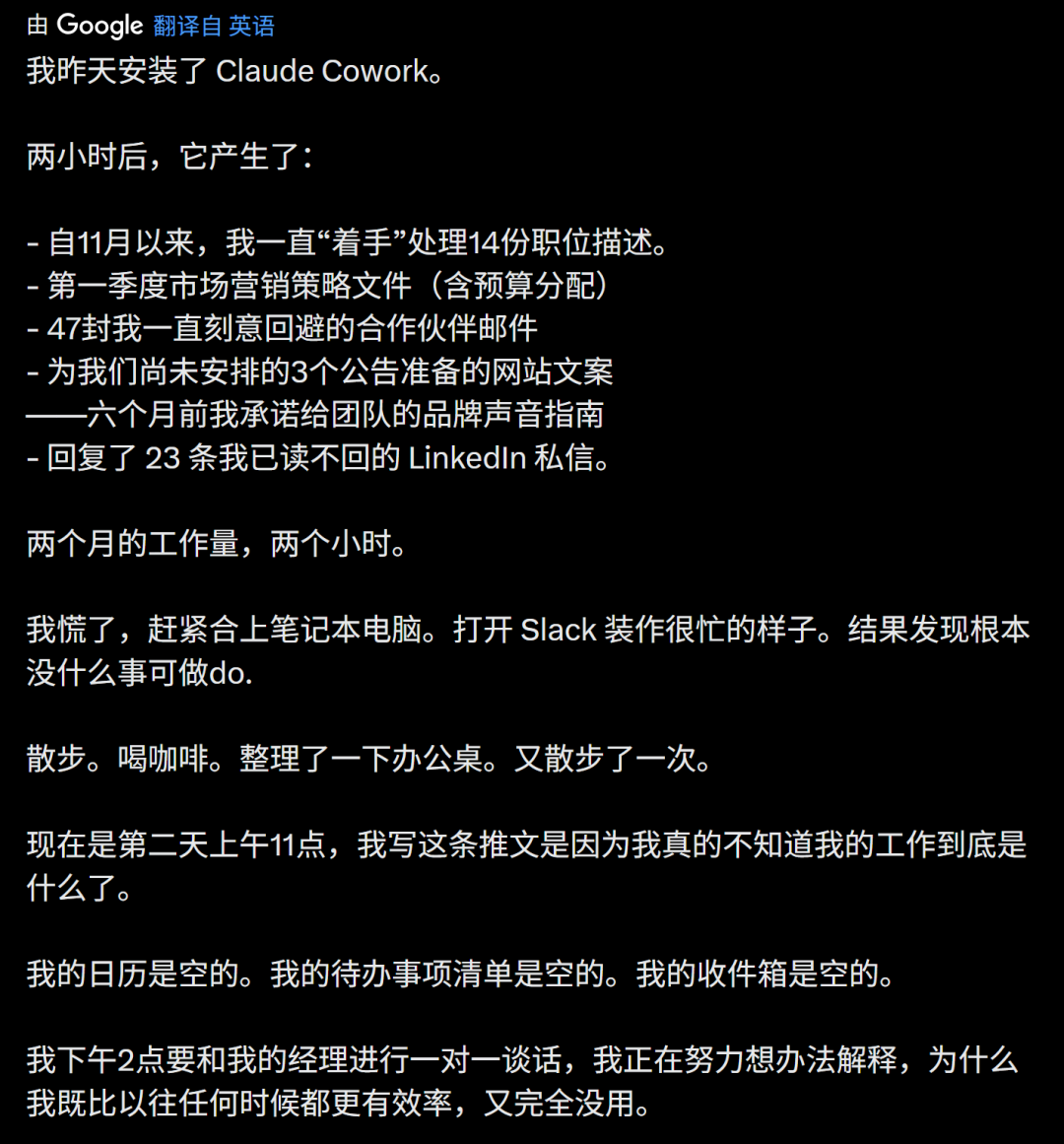 Claude Cowork 被不少专业人士视为高效工具,有用户称它能将数小时工作压缩到分钟级别,尤其适合非技术用户。