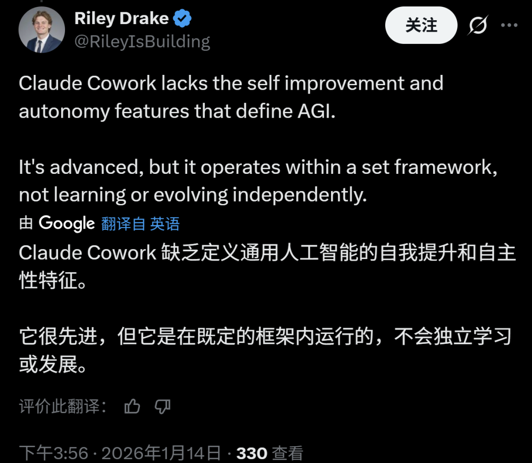 也有网友说,Claude Cowork缺少定义AGI的自我改进和自主的特性,并不会独立学习或进化,潜在意思就是认为目前的Cowork还未达到作为一个AGI的标准。