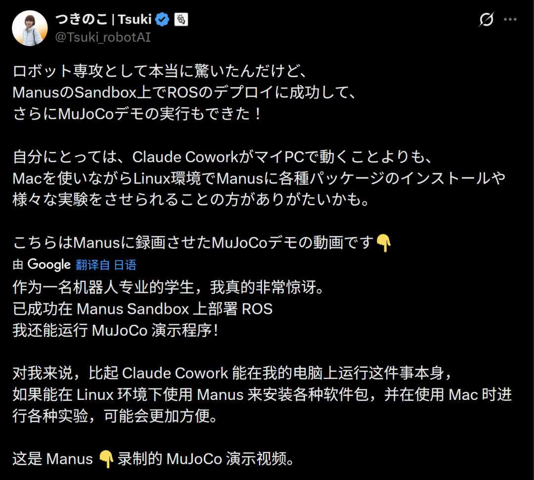 就在10小时前,Manus AI日本负责人在X上发文称,“比起Cowork,在安装各种软件包、进行各种实验时,Manus可能会更加方便”。