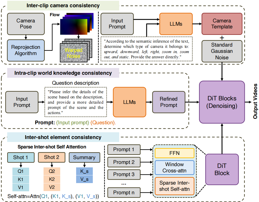 优化后的 经嵌入后作为文本条件输入DiT骨干网络。该模块将语义推理与视觉生成解耦,在不修改扩散架构的前提下,显著提升了片段内世界知识的一致性。