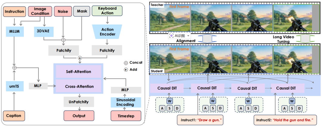 Hunyuan-GameCraft-2 整体框架如图 1 所示,该模型将自然动作注入的因果架构、图像条件的自回归长视频生成以及多样化的多提示交互整合为一个统一的框架。