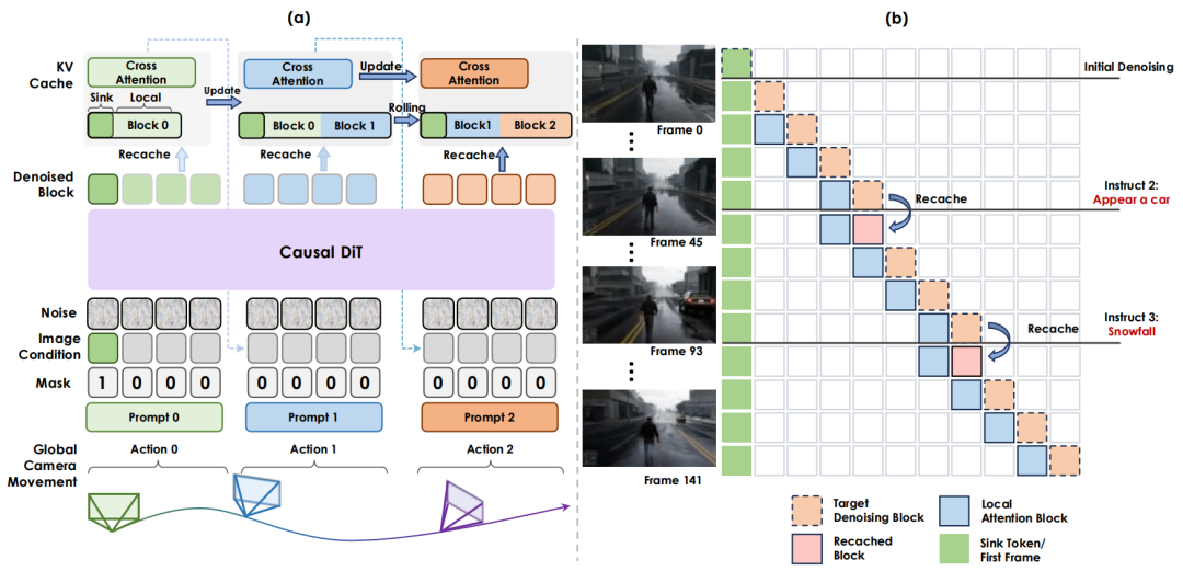 图 2 多轮交互推理。图(a)展示了用于长视频生成的分块自回归推理流程及相应的 KV 缓存更新机制。提示重缓存机制如图(b)所示。