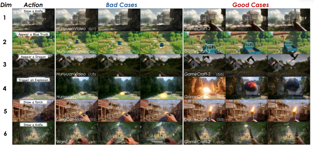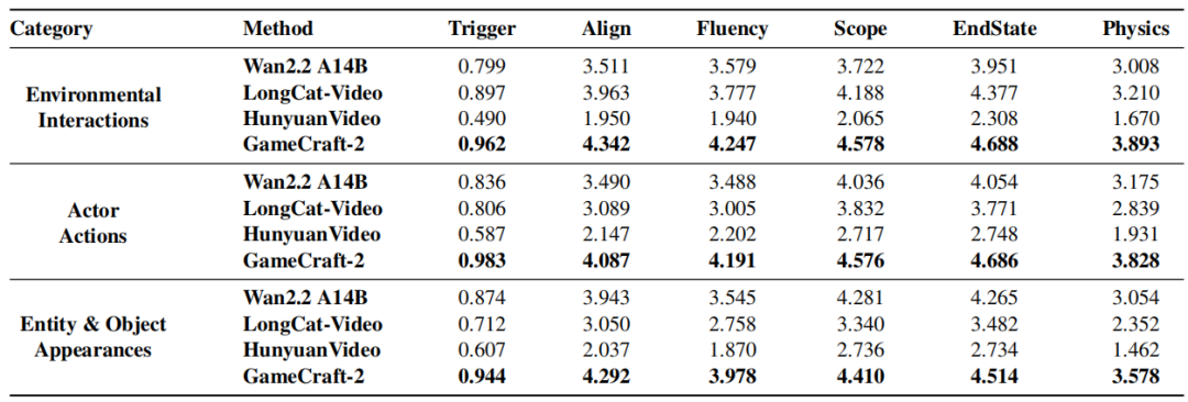 表 1 展示了三个交互类别的定量结果。按类别分析显示,GameCraft-2 的优越性首先体现在极高的交互启动成功率:环境交互触发率达0.962,主体动作达0.983,显著超越所有基线。在交互保真度方面,模型在物理真实感上表现突出,环境交互物理性维度领先次优模型0.683分,实体与对象出现类别领先超0.52分。同时,在时间连贯性与终态稳定性上也有显著提升,主体动作的流畅性与终态得分分别提高+0.70和+0.63。综上,GameCraft-2不仅能可靠触发交互,还能以高保真的语义、动态和物理一致性进行渲染。如图 3 所示,针对每个维度,通过 GameCraft-2 的高分示例(右侧)与基线模型的低分示例(左侧)进行对比,直观展示评分标准。