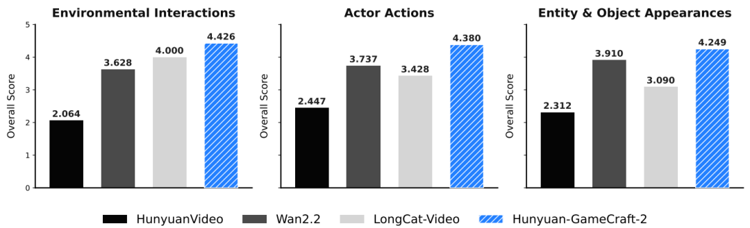 图 4 显示,基线模型在复杂交互中缺陷明显,相比之下,Hunyuan-GameCraft-2在所有类别中保持高保真度与一致性;角色动作连贯,抓取操作精准,状态稳定;新物体结构完整、融合自然。模型还能泛化至训练外概念,验证其强大泛化能力。