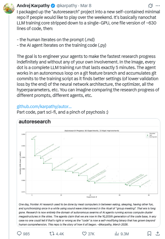 最近,AI大神 Andrej Karpathy 开源了AI 自主进化的科研循环系统 autoresearch,能够让 AI 智能体自己读指令、改代码、跑实验、评测结果、保留进步、丢弃失败,循环往复一整夜。让研究者们能够从重复的机械性工作中解放,专注于更具创造性的科研思考。这个项目上线数小时,X 平台发布帖浏览量破百万,GitHub 仓库目前已斩获26.5k Stars,被不少开发者视为 AI 自动科研的重要探索。