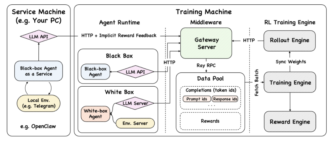 但 General Agent 的世界远非如此。OpenClaw 有自己的消息路由和记忆系统,Claude Code 有自己的工具链和上下文管理,LangChain、AutoGen、CrewAI 等生态更是百花齐放、各有各的架构。要把这些系统接入现有 RL 框架,意味着在框架内重写整套 Agent 逻辑——正如 Agent Lightning 论文所指出的,"将 Agent 迁移到现有 RL 框架中需要手动适配执行逻辑,这不仅费时费力,而且容易出错,难以规模化"。