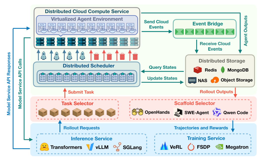 2)智能体服务作为智能协调器,根据任务需求管理智能体的执行策略。它集成了多种智能体框架(如 OpenHands、SWE-Agent和Qwen Code),可适配不同任务类型(包括训练、评估或数据合成),并在指定数据集上协调 rollout 执行。该服务处理 rollout 输出,汇总评估指标,并将经验数据反馈给模型服务以进行训练迭代。